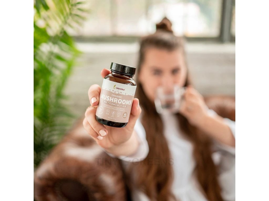 Blendea Mushrooms BIO Organic obsahuje směs 7 druhů BIO hub v kapslích: reishi, chaga, shiitake, maitake, hericium, cordyceps a tremella. Houby jsou šetrně zpracovány a baleny do veganských kapslí bez aditiv, konzervantů či plnidel. Produkt je 100 % přírodní a vhodný pro každodenní užívání.